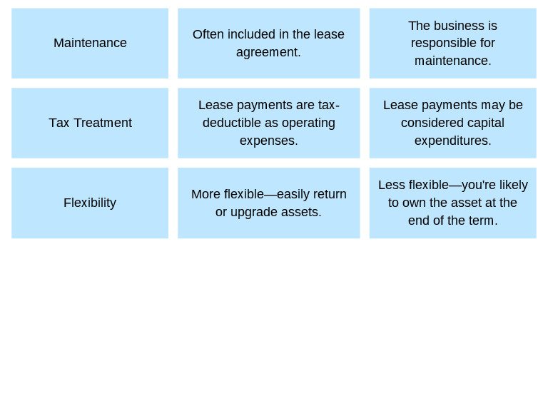 You get to decide what happens when the lease ends. You can return the asset and get a new one or extend the lease. - No Long-Term Commitment