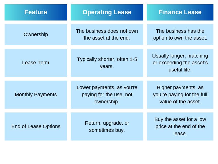 Both Operating Leases and Finance Leases let businesses use assets without buying them, but there are some differences that separate the two.