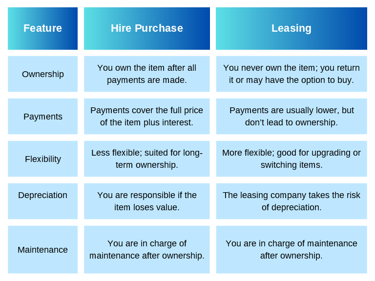 - Flexibility: Leasing is more flexible if you want to switch or upgrade items often. Hire purchase is better if you plan to keep the item for a long time because you will own it once all payments are made.